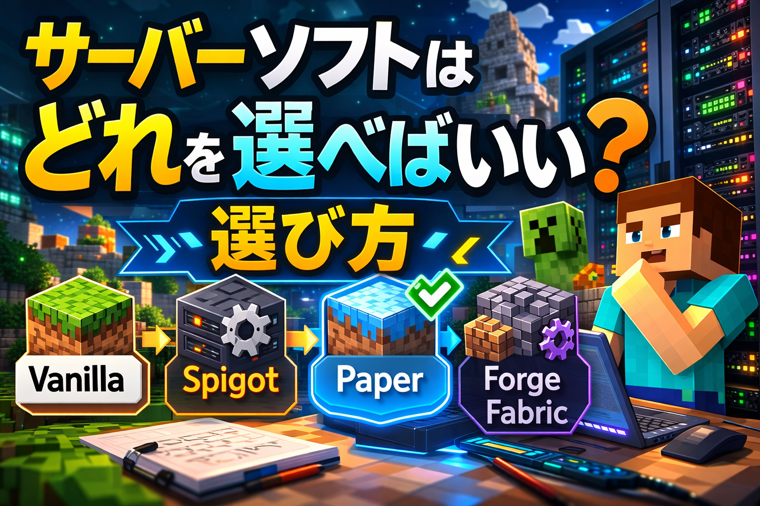 マインクラフトサーバーを立てるとき、最初に迷うのがサーバーソフトの種類です。 「Vanilla?Paper?Spigot?何が違うの?」 と疑問に思う人も多いでしょう。 この記事では、マインクラフトサーバーソフトの違いと...