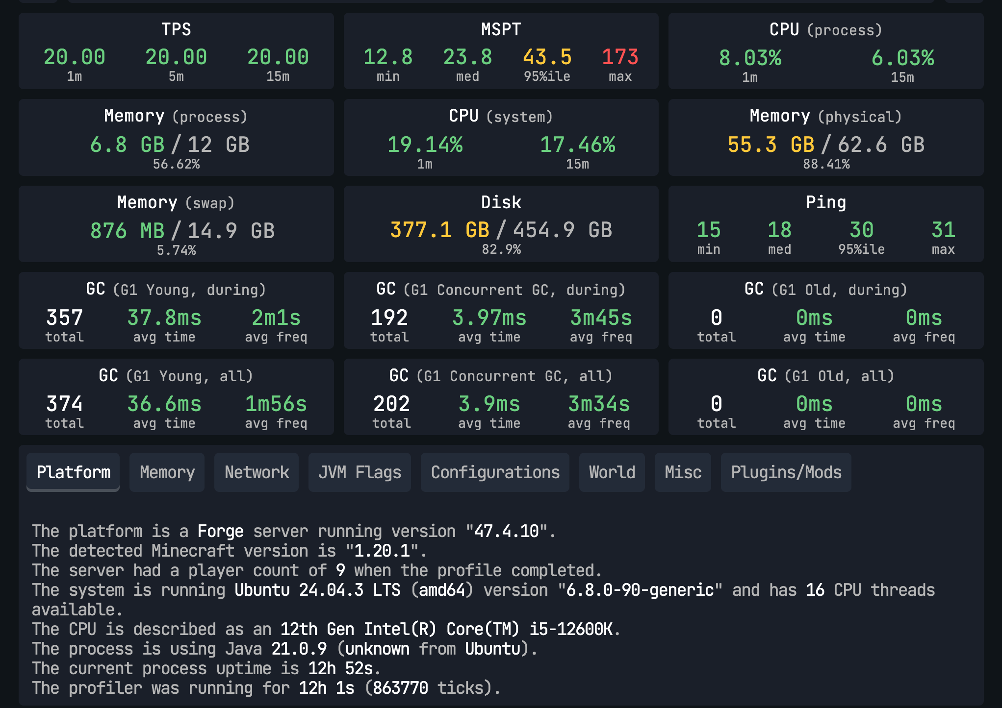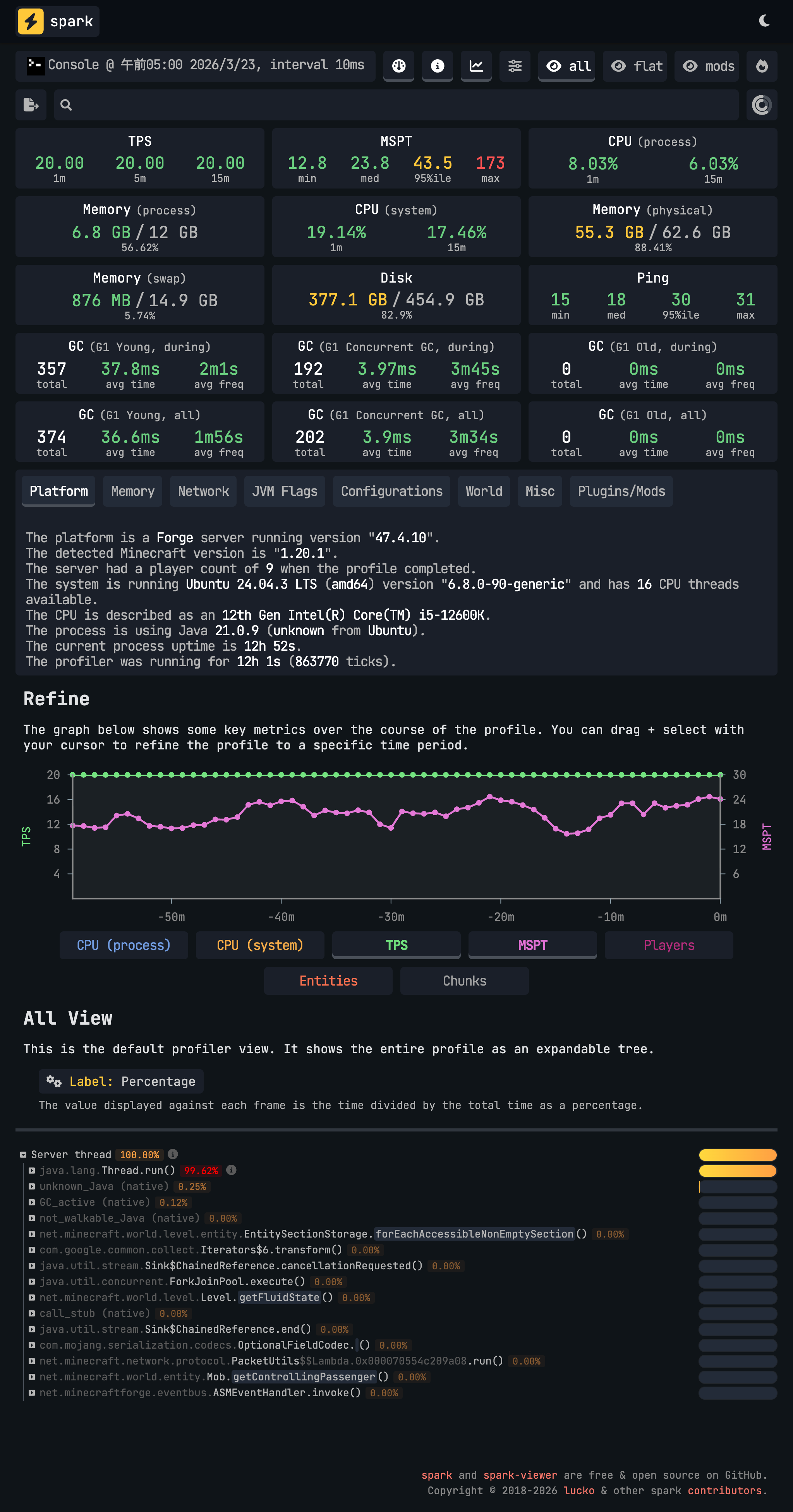 Sparkは、Minecraftサーバーの内部処理を可視化できるプロファイラーです。サーバーの中でどの処理に負荷がかかっているのかを、数値やグラフとして確認できます。