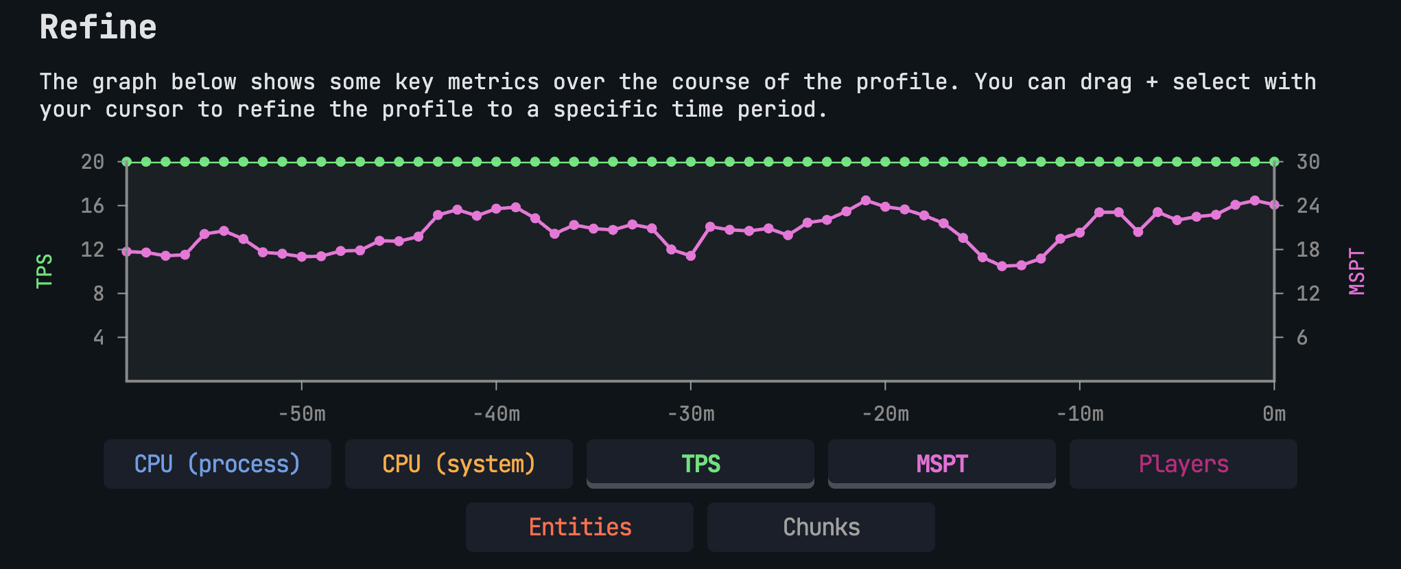 - MSPT:Milli Second Per Tick ミリ秒毎Tickのことです。1ティックは1/20秒なので、MSPT50以下が正常値です。