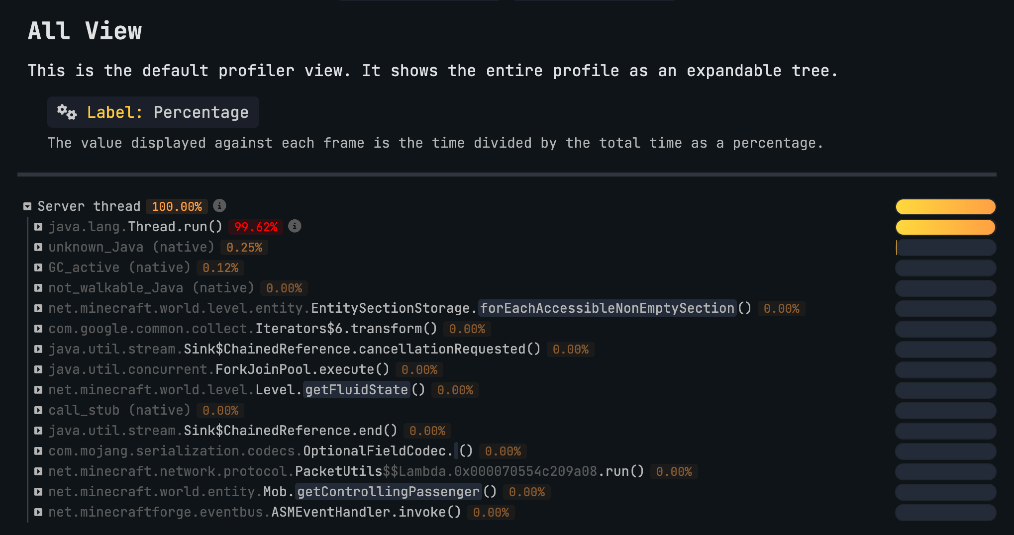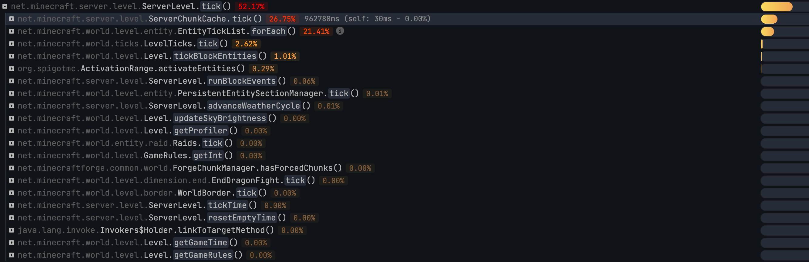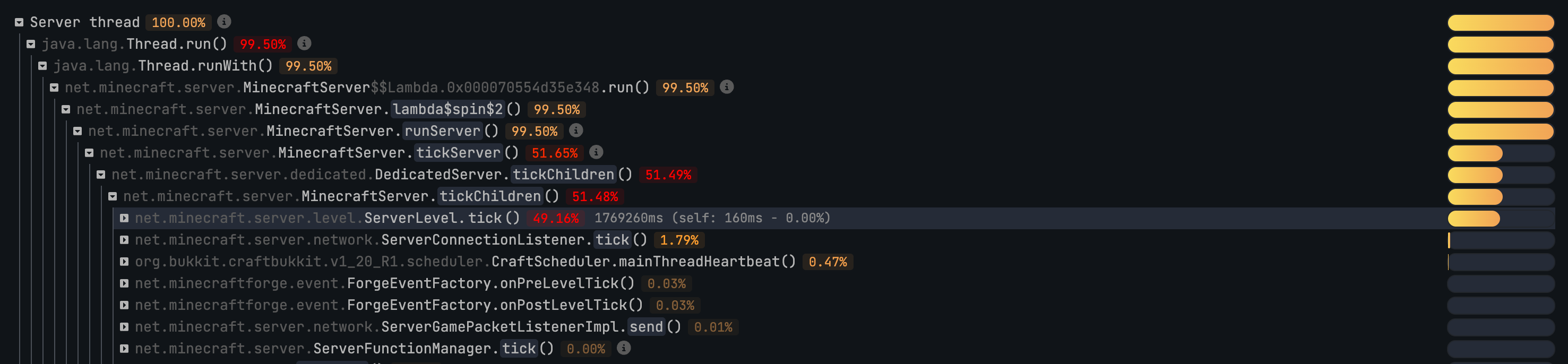 さらに展開してみると、ServerLevel.tick()53.26%が大部分を占めていることがわかります。